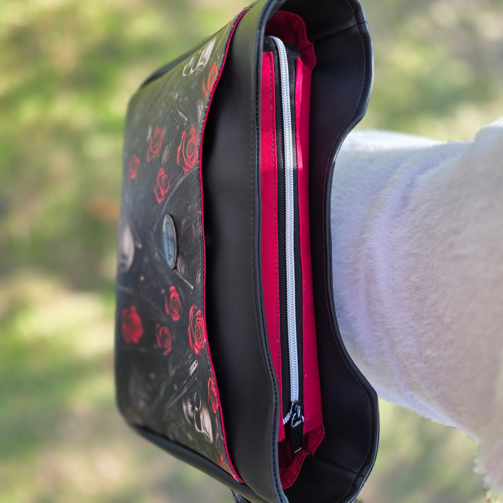 Black Vinyl with Skull, zipper and red Roses accent front pocket